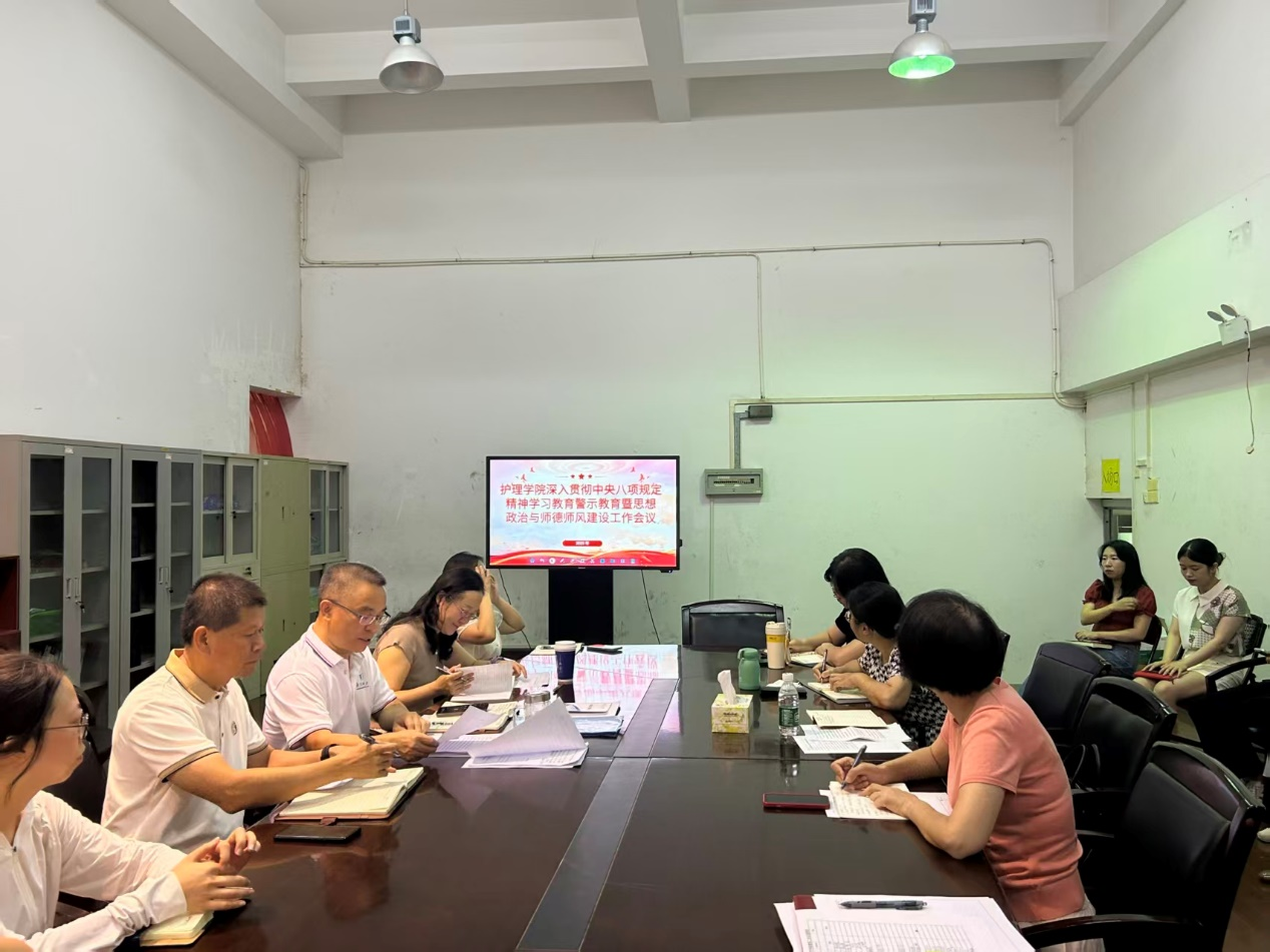 2025年9月28日上午,护理学院党委在云浮校区学院225会议室,召开深入贯彻中央八项规定精神学习教育总结会议,会议深入学习习近平总书记关于作风建设的重要指示精神,传达上级及学校有关通报要求,全面总结学院学习教育工作成效,系统部署下一阶段作风建设工作。学院领导班子、党委委员、专职组织员、各党支部书记及支委、学院办公室负责人参加,会议以线上线下方式召开,由学院党委书记陈国新主持。
