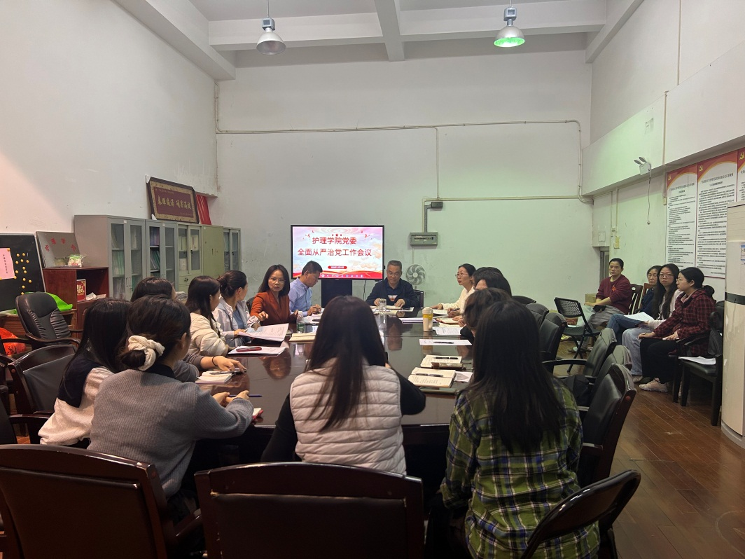 2026年3月13日,护理学院党委在赤岗校园综合楼四楼会议室召开了全面从严治党工作会议。会议由学院党委书记陈国新主持,学院全体教工党员、学生党支部委员参加了会议。