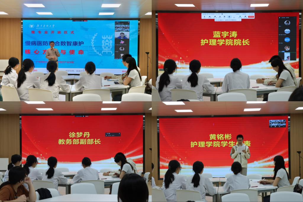 2026年3月30日上午,广东药科大学护理学院与广州衡必康信息科技有限公司联合主办的慢病医防融合数智康护微专业开班仪式,在护理楼五楼智慧病房示教课室顺利举行,仪式同步开启线上直播。护理学院党委书记陈国新、院长蓝宇涛、副院长蔡舒,广东药科大学教务部副部长徐梦丹,广东药科大学医药康护产业学院副院长、医学人工智能系专任教师、广州衡必康信息科技有限公司董事长彭勇出席仪式,全体微专业学员参与本次活动,由蔡舒副院长主持仪式。