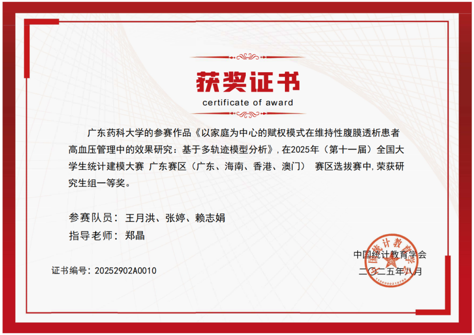 近日,2025年(第十一届)全国大学生统计建模大赛圆满落幕。广东药科大学护理学院研究生代表队(队员:王月洪、张婷、赖志娟,指导老师:郑晶)凭借扎实的专业知识和数据分析能力,斩获广东赛区一等奖及全国总决赛三等奖,实现学院在该项赛事上的新突破。
