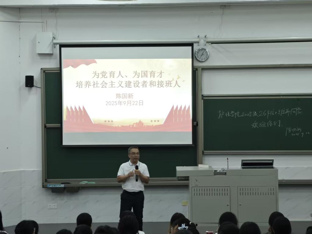 为深入贯彻落实“为党育人、为国育才”的根本使命,扎实推进立德树人工作,2025年9月22日晚上,护理学院在云浮校区教学楼111教室举行2025年秋季学期“思政第一课”。本次课程以“培养社会主义建设者和接班人”为主题,由学院党委书记陈国新主讲,辅导员王欢和25级全体新同学参加学习。