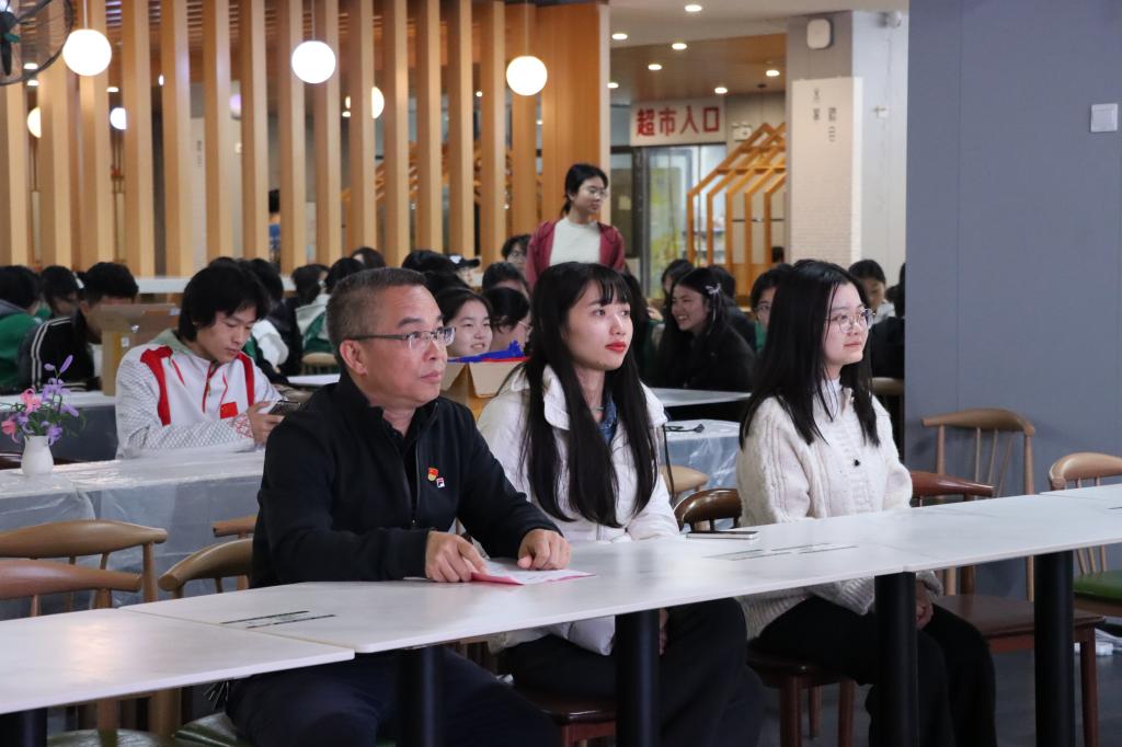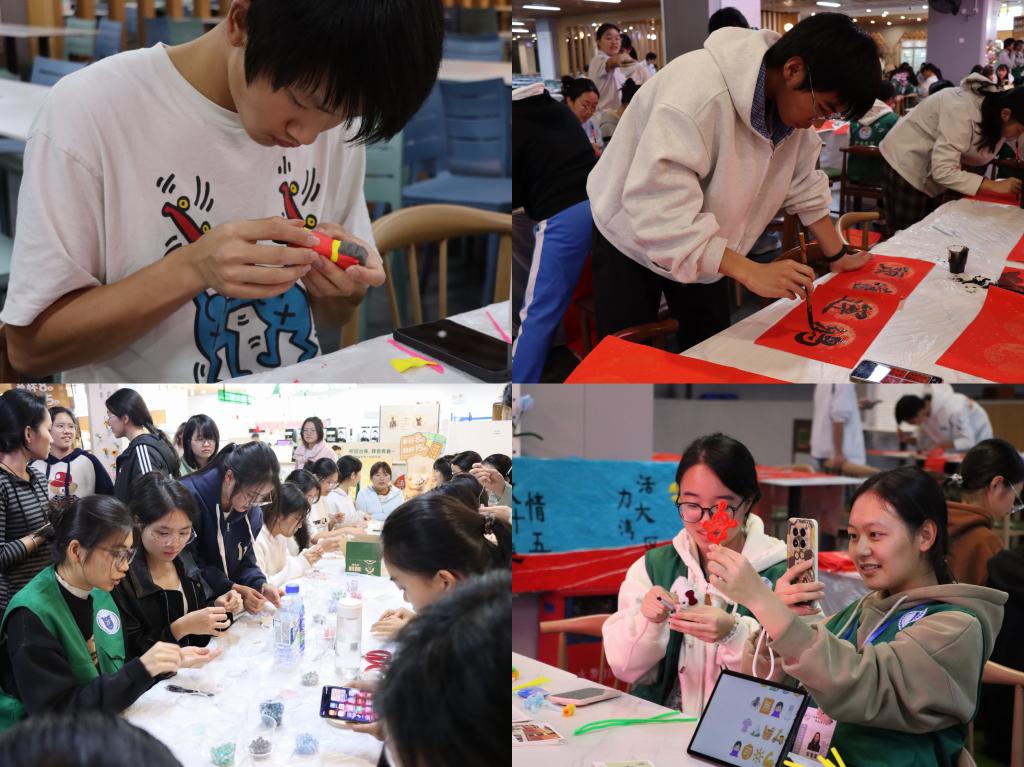 本次活动互动环节丰富多样,同学们在“新年珠语”中编织好运手链,将新年期许融入丝线;“手作安康”区备有扭扭棒、羊毛毡等材料,大家创意创作手工作品;“春联对对碰”深受传统文化爱好者喜爱,同学们挥毫书写吉祥春联,传递新春祝福。“表情四字成语”“猜灯谜”等趣味游戏更让现场欢声笑语、热闹非凡。活动现场还播放了精心准备的新年祝福视频,温情满满的画面传递着师生间的真挚情谊,让冬日的校园洋溢着浓浓的暖意。